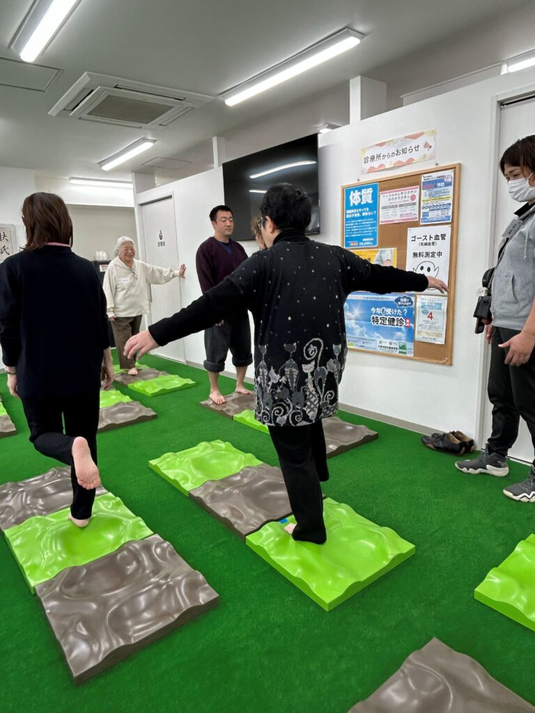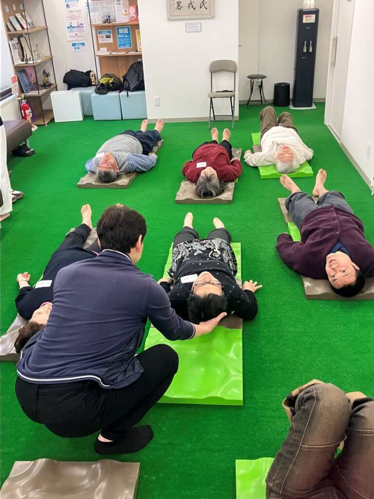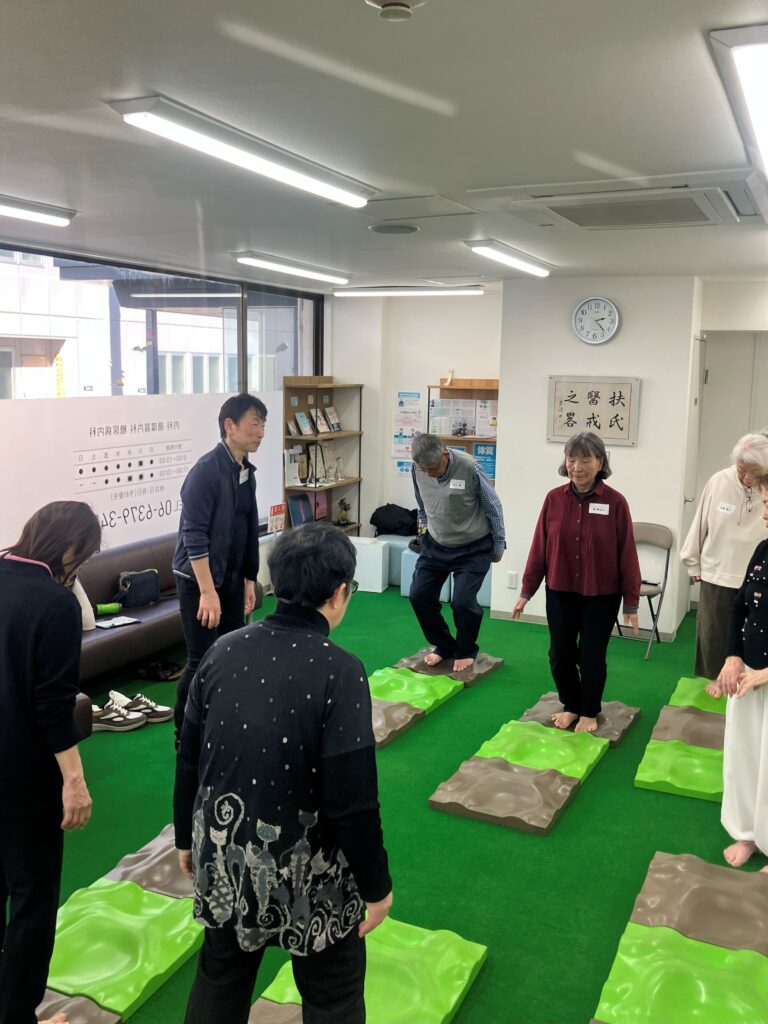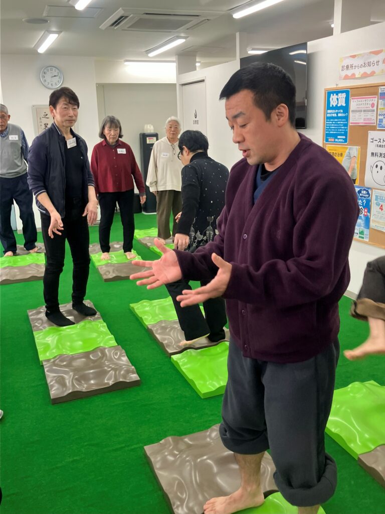 今回のイベント内容は、運動療法体操インストラクターの山本哲矢さんよりドイツの医療機関でも使用されてるという【テラセンサ】という凹凸のあるウレタンのような柔らかいマットの上で運動を紹介していただきました。